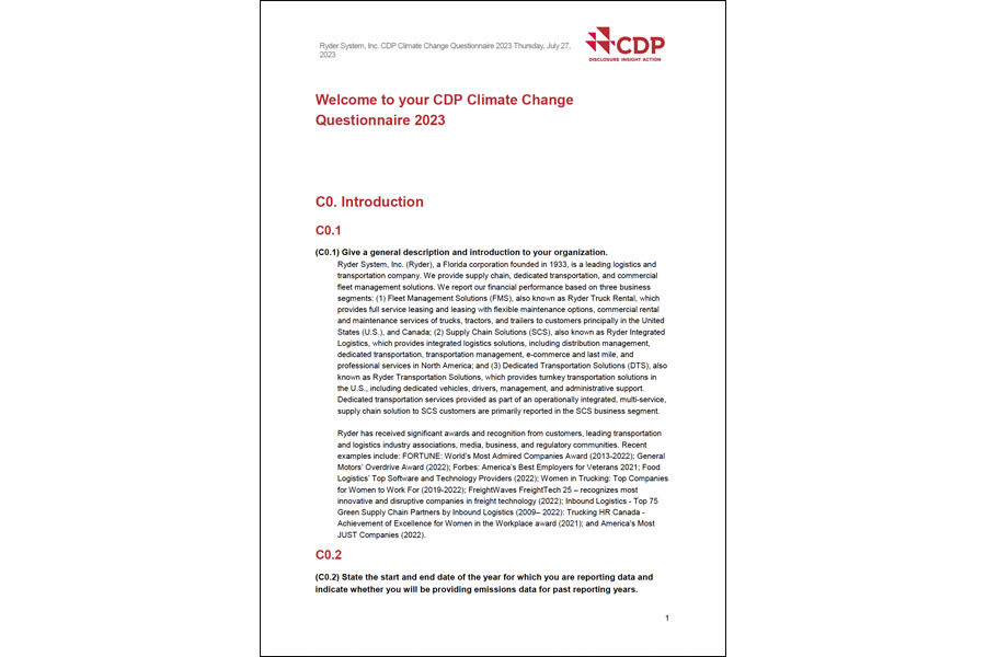 The 2024 Ryder Corporate Sustainability Report (CSR) references the Global Reporting Initiative (GRI) Standards, the Sustainability Accounting Standards Board (SASB) Air Freight and Logistics Standard, and the Task Force on Climate-Related Financial Disclosures (TCFD), for the period of January 1 through December 31, 2024.