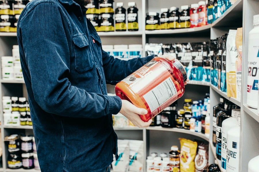 customer holding large tub of supplements
