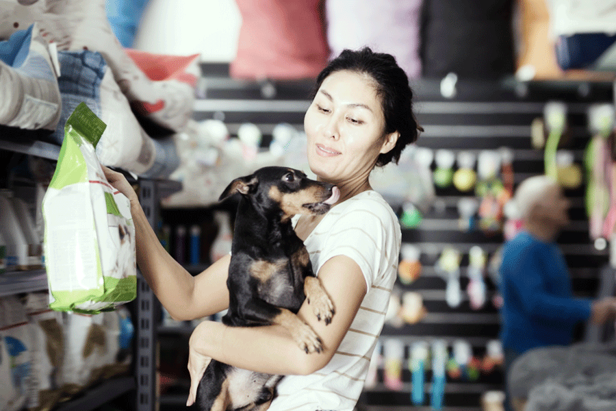 person with dachshund buying dog food