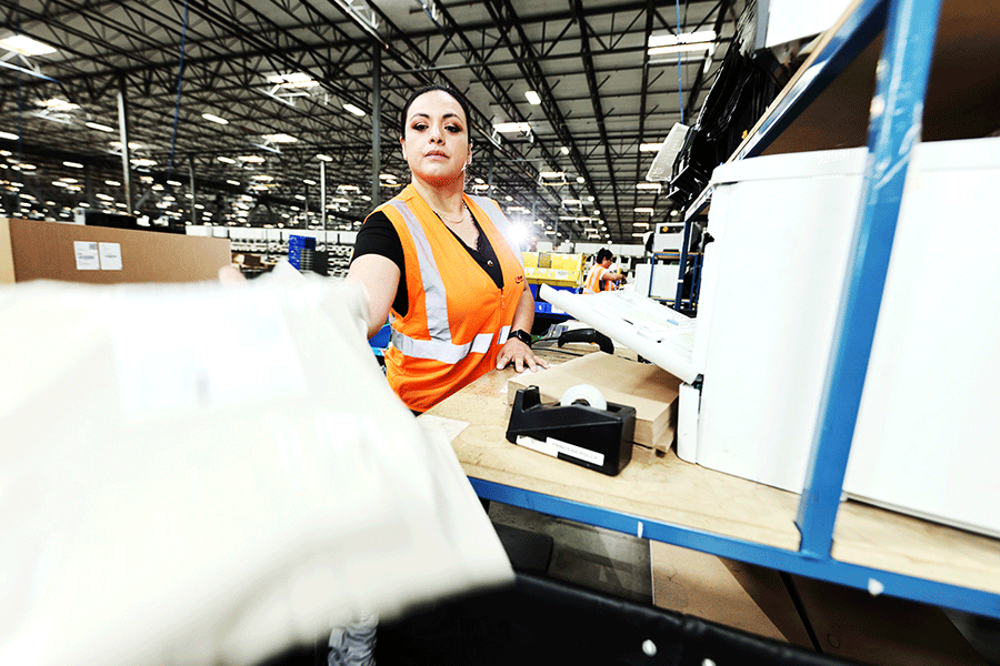 fulfillment center employee handing off package