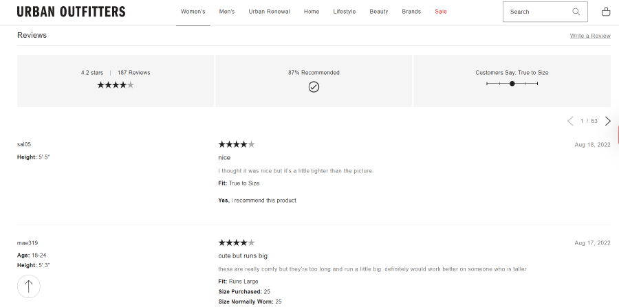 Popular apparel brand Urban Outfitters provides online shoppers with a quick overview of reviews, including a sizing review that lets them know how the product fits: "true to size," "runs small," or "runs large."